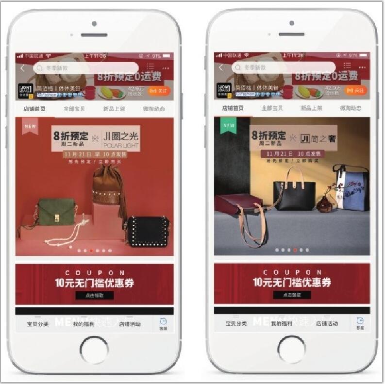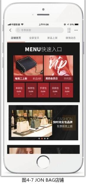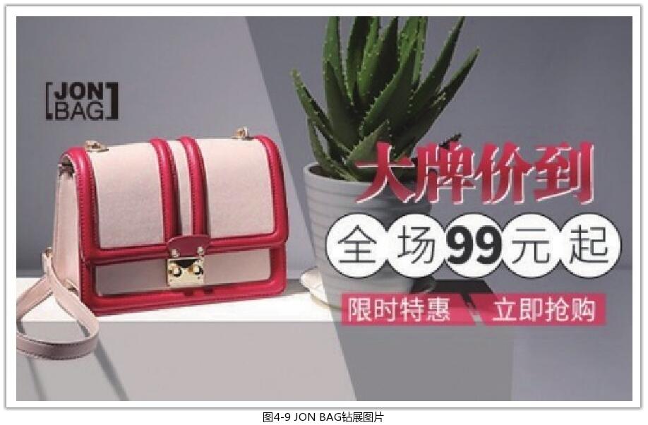 又如JON BAG店鋪,賣家在對店鋪中的箱包商品進行宣傳與推廣時便進行了相應的犧牲。JON BAG店鋪中箱包的款式可謂多種多樣,如圖4-7所示。