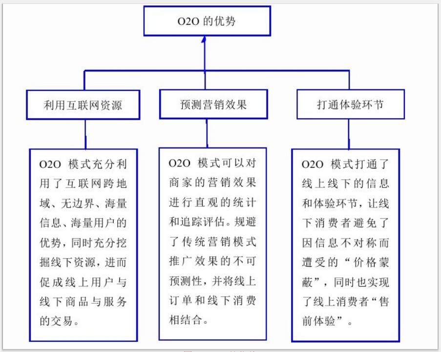 圖1-1 O2O示意圖依靠互聯(lián)網(wǎng)平臺,讓互聯(lián)網(wǎng)與線下商家完美對接,實現(xiàn)互聯(lián)網(wǎng)落地。它的好處在于把線上和線下的優(yōu)勢完美結(jié)合,讓消費者在線上能夠得到更多的優(yōu)惠,還能在線下得到優(yōu)質(zhì)的服務(wù)。同時,O2O模式還能夠使眾多商家結(jié)成同盟。其優(yōu)勢具體體現(xiàn)在以下三個方面,如圖1-2所示。
