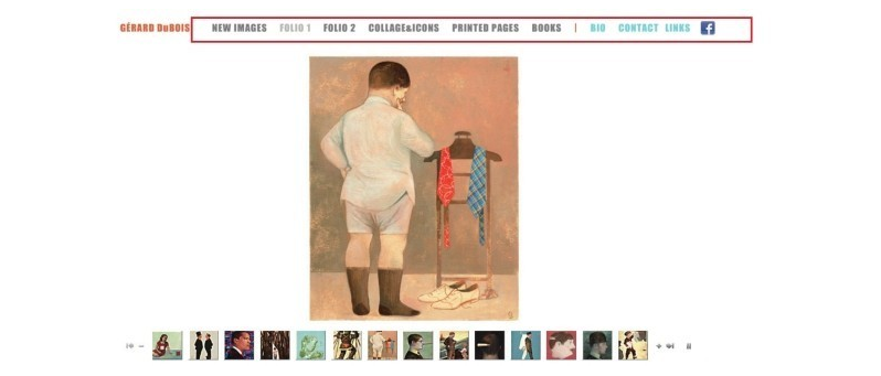 傳統(tǒng)的全局導(dǎo)航菜單是頂部、底部或側(cè)面固定。導(dǎo)航菜單固定在頁(yè)面頂部的形式運(yùn)用范圍十分廣泛,它能靈活地布局圖文和多媒體信息,如某些個(gè)人網(wǎng)站(見(jiàn)圖1),無(wú)論進(jìn)入到站內(nèi)的哪個(gè)頁(yè)面,全局導(dǎo)航的菜單都置于頂部;導(dǎo)航菜單位于界面底部的布局常用于信息內(nèi)容不多,能在一屏內(nèi)展示完信息及效果的網(wǎng)站,如意大利高級(jí)珠寶伯蒂諾網(wǎng)站(見(jiàn)圖2),該網(wǎng)站的全局導(dǎo)航位于界面的底部不變,導(dǎo)航上方拖曳鼠標(biāo)可以觀看有趣的視差變化;全局導(dǎo)航區(qū)域固定在側(cè)面的形式優(yōu)勢(shì)在于能合理控制網(wǎng)站的結(jié)構(gòu),該布局會(huì)營(yíng)造出簡(jiǎn)潔大氣的風(fēng)格,如Georgina Bousia網(wǎng)站(見(jiàn)圖3),左側(cè)導(dǎo)航的簡(jiǎn)潔與右側(cè)圖片精致形成強(qiáng)烈對(duì)比,使得網(wǎng)站內(nèi)容及導(dǎo)航區(qū)域一目了然。