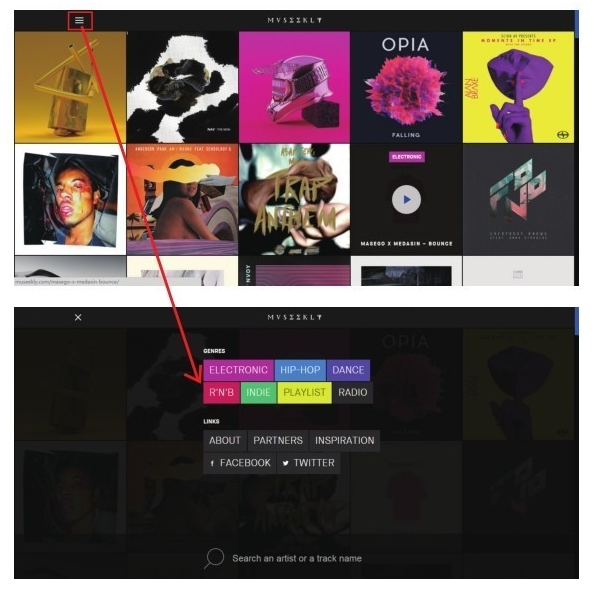 隨著時(shí)代的發(fā)展,全局導(dǎo)航也出現(xiàn)了更多新的形態(tài),如Names for Change網(wǎng)站(見(jiàn)圖4)全局導(dǎo)航菜單頂部與底部兼?zhèn)?,不過(guò)兩者有主次之分,頂部菜單完全展示,單擊菜單后是當(dāng)前頁(yè)面的跳轉(zhuǎn),而底部菜單則需要單擊方向圖標(biāo)才能展開(kāi),并且單擊后會(huì)另外打開(kāi)一個(gè)窗口;再如MUSEEKLY網(wǎng)站(見(jiàn)圖5)導(dǎo)航菜單被隱藏在漢堡圖標(biāo)(俗稱(chēng)三條線圖標(biāo))中,當(dāng)鼠標(biāo)單擊圖標(biāo)后會(huì)跳出彈框選擇,此類(lèi)導(dǎo)航雖隱蔽但可以讓頁(yè)面更整潔,為視覺(jué)設(shè)計(jì)留下更大的空間??傊?,無(wú)論全局導(dǎo)航身處界面何處都是為了幫助用戶訪問(wèn)到站內(nèi)任意頁(yè)面,完成各個(gè)頁(yè)面間的跳轉(zhuǎn)。