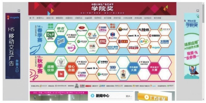 浮動式廣告是指打開頁面時置于文字、圖片之上,來回飄浮的廣告。有的是跟隨鼠標(biāo)移動軌跡滑動,有的則是靜止或有自己的運(yùn)動軌跡。如中國大學(xué)生廣告藝術(shù)節(jié)學(xué)院獎網(wǎng)站(見圖4),它兩側(cè)的浮動廣告無論是頁面跳轉(zhuǎn)還是向下瀏覽頁面,都會浮于頁面固定位置上,除非你單擊關(guān)閉圖標(biāo)。此類型的網(wǎng)絡(luò)廣告侵?jǐn)_性非常強(qiáng),容易影響并且中斷用戶體驗(yàn),使用時要十分謹(jǐn)慎。