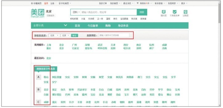 美團網(wǎng)(見圖3)在更換地理位置的頁面中,用戶可以根據(jù)省市的地理位置在下拉框中進行精準(zhǔn)選擇,默認地名的排序是按拼音首字母進行排列。