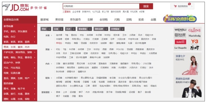 比如京東網(wǎng)的商品組織方式(見圖2)就使用了層級結(jié)構(gòu)。在首頁左側(cè)的全局導(dǎo)航中就將眾多商品清晰地劃分為三個(gè)層級菜單。其中,一級菜單將全部商品分為15大類,當(dāng)鼠標(biāo)光標(biāo)懸停在某一大類上時(shí),一級菜單右側(cè)就會(huì)出現(xiàn)其對應(yīng)的二級菜單及三級菜單。這樣一來,用戶不用逐個(gè)瀏覽網(wǎng)頁也能輕松理解京東網(wǎng)龐大的商品類型。