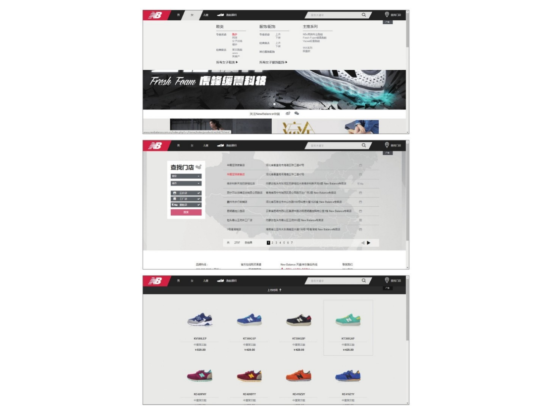 如New Blance網(見圖2)中,界面各功能布局相對固定,均為頂部為固定全局導航,導航下方呈單頁的信息內容展示,圖形造型上十分統(tǒng)一,Logo傾斜的矩形形態(tài)反復出現(xiàn)在界面的菜單選中狀態(tài)、搜索框等多個元素造型中,色彩搭配上每個頁面都是使用淺灰作為背景,字體默認顏色使用深灰與黑色,對于需要特別強調的位置使用Logo的紅色。