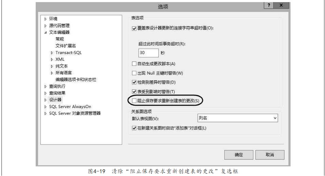 注意默認在SQLServer2012設(shè)計器中修改表結(jié)構(gòu)時會提示不允許保存更改。解決方法是在SQLServerManagementStudio中選擇菜單“工具”→“選項”,彈出如圖4-19所示的對話框,