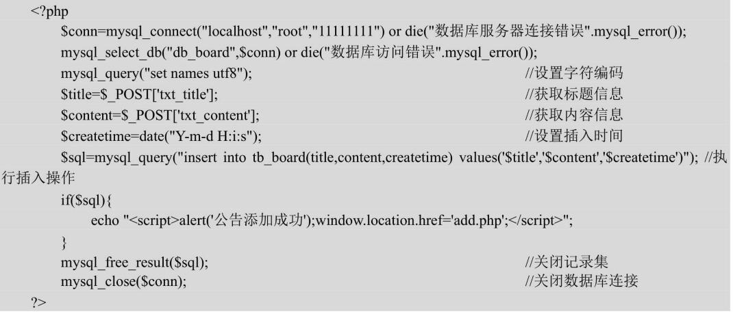 實(shí)現(xiàn)公告信息的添加功能,主要用到SQL的INSERT語句,使用mysql_query()函數(shù)執(zhí)行INSERT語句,完成將表單中的數(shù)據(jù)添加到數(shù)據(jù)庫中。