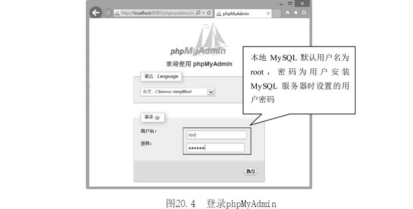 第2步,登錄MySQL數(shù)據(jù)庫(kù)。在登錄界面輸入MySQL數(shù)據(jù)庫(kù)的用戶名和密碼,本地MySQL默認(rèn)用戶名為root,密碼為用戶安裝MySQL服務(wù)器時(shí)設(shè)置的用戶密碼,輸入完畢,單擊【執(zhí)行】按鈕即可,如圖20.4所示。