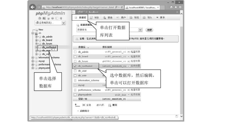 第2步,進(jìn)入數(shù)據(jù)庫以后,現(xiàn)在左邊的側(cè)邊欄里顯示著數(shù)據(jù)庫的各個(gè)表,單擊就可以進(jìn)入,也可以單擊右邊的圖標(biāo),如圖20.27所示。