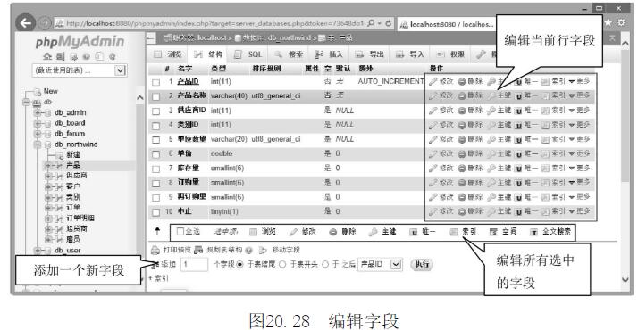 第3步,當(dāng)單擊數(shù)據(jù)表的結(jié)構(gòu)操作圖標(biāo),可以打開數(shù)據(jù)表結(jié)構(gòu),在這里可以對數(shù)據(jù)表字段進(jìn)行插入、修改、刪除等各種操作,如圖20.28所示。