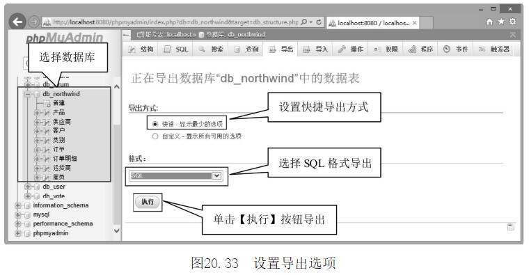 第1步,啟動(dòng)phpMyAdmin,登錄之后進(jìn)入phpMyAdmin首頁,在首頁右側(cè)內(nèi)容區(qū)域主導(dǎo)航欄中單擊【導(dǎo)出】鏈接選項(xiàng),如圖20.32所示。