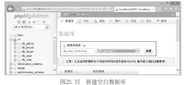 第1步,啟動(dòng)phpMyAdmin,登錄之后進(jìn)入phpMyAdmin首頁,在頁面中新建一個(gè)空數(shù)據(jù)庫,或者選擇一個(gè)已經(jīng)建立好的數(shù)據(jù)庫,如圖20.35所示。