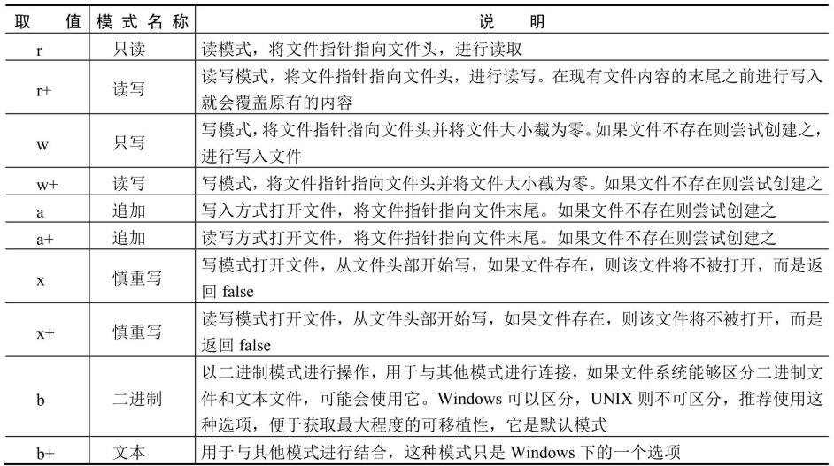 表21.1 fopen()中參數(shù)Node的取值列表