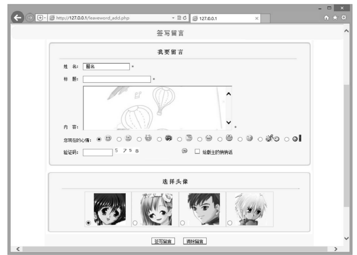 互聯(lián)網(wǎng)時代很多客戶在要求網(wǎng)站制作時,都需要有在線留言功能,那么PHP網(wǎng)站在制作時怎樣實現(xiàn)這一功能?深圳網(wǎng)站設(shè)計公司認(rèn)為寫入留言在簽寫留言時,同時支持過濾敏感詞、添加留言心情、支持給版主寫悄悄話(私帖),還可以選擇有個性的頭像。同時,為了方便用戶查看留言后及時簽寫留言信息,在留言板首頁的查看留言的正下方設(shè)置了簽寫留言版塊,以及在留言板頭部導(dǎo)航欄中設(shè)置了簽寫留言的超鏈接。用戶可以進(jìn)行雙向選擇簽寫留言信息。簽寫留言頁面的運行結(jié)果如圖22.14所示。