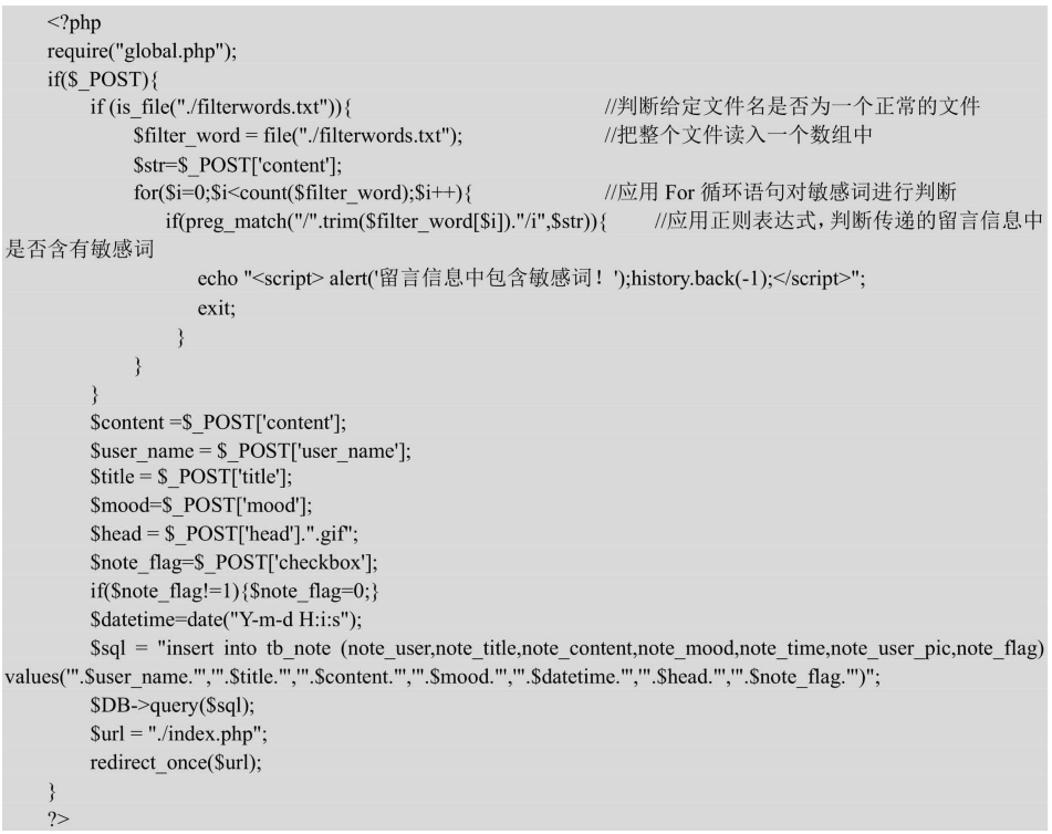 第4步,提交表單信息到數(shù)據(jù)處理頁,首先需要對用戶的留言信息進(jìn)行敏感詞過濾,然后應(yīng)用POST方法接收用戶提交的留言信息(note_check.php)。