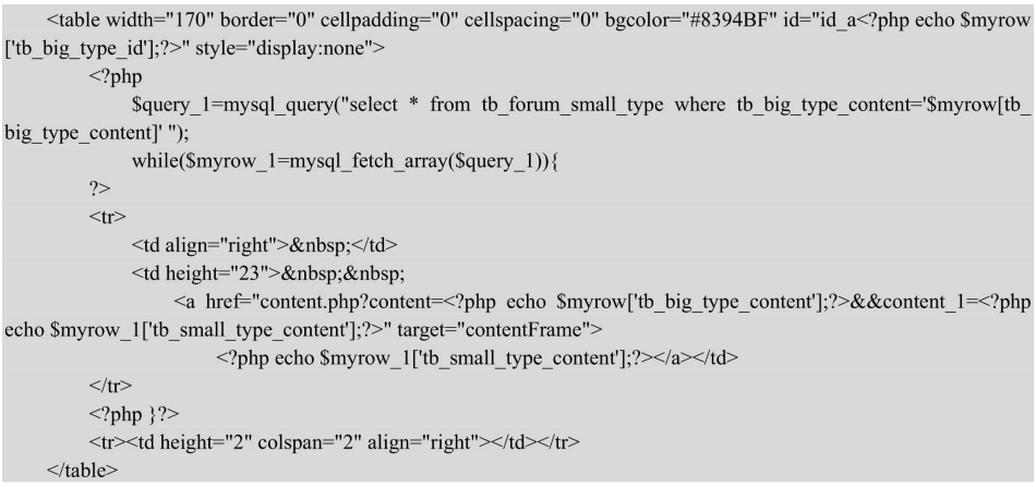 第2步,創(chuàng)建表格,輸出所屬專區(qū)的數(shù)據(jù),應(yīng)用onClick事件調(diào)用JavaScript語句open_close()控制單元格中內(nèi)容的隱藏和顯示,其中還為單元格中的內(nèi)容設(shè)置了超鏈接,鏈接到指定的文件。代碼如下: