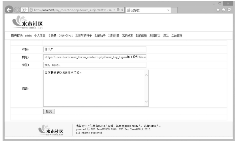 在獲取到完整的地址之后,接下來將帖子的標(biāo)題、當(dāng)前頁面的完整路徑和當(dāng)前用戶數(shù)據(jù)提交到my_couection.php頁中,生成一個(gè)表單,最后將數(shù)據(jù)提交到my_coflection_ok.php文件中,完成帖子的收藏。提交帖子完整地址和帖子標(biāo)題的程序代碼如下: