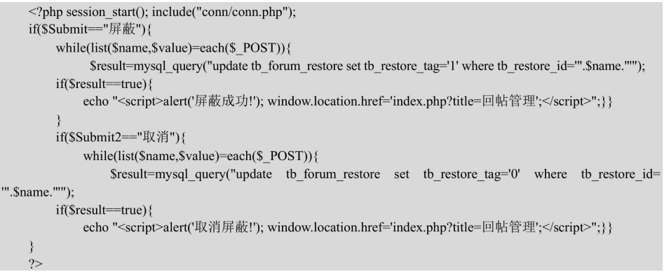 屏蔽回帖是管理員的權(quán)限,在論壇的后臺(tái)管理中進(jìn)行操作?;貜?fù)是否被屏蔽是根據(jù)回復(fù)帖子數(shù)據(jù)表中tb_restore_tag字段的值來判斷的,如果帖子tb_restore_tag字段的值為1,則說明該帖子被屏蔽;否則帖子沒有被屏蔽。因此屏蔽回帖就是將指定帖子的tb_restore_tag字段的值更新為l。屏蔽回帖主要通過兩個(gè)文件來完成,一個(gè)是message_restore.php,輸出回復(fù)帖子的內(nèi)容,創(chuàng)建執(zhí)行屏蔽帖子的form表單。另一個(gè)是message_store.php,根據(jù)提交的數(shù)據(jù),實(shí)現(xiàn)屏蔽帖子的操作。關(guān)鍵代碼如下(admin/message_restore_ok.php):