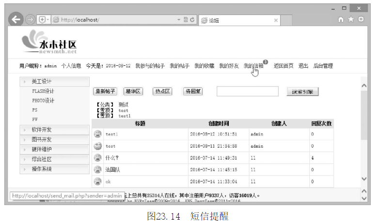 短信提醒的無刷新輸出主要應(yīng)用的是Ajax技術(shù)。通過Ajax技術(shù)調(diào)用指定的文件查詢是否存在新的消息,并且將結(jié)果返回,通過span輸出Ajax中返回的查詢結(jié)果。運(yùn)行結(jié)果如圖23.14所示。