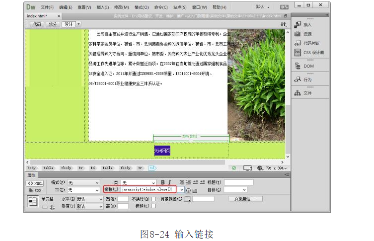 ?在【屬性】面板【鏈接】文本框中輸入“javascript:window.close()”,如圖8-24所示。