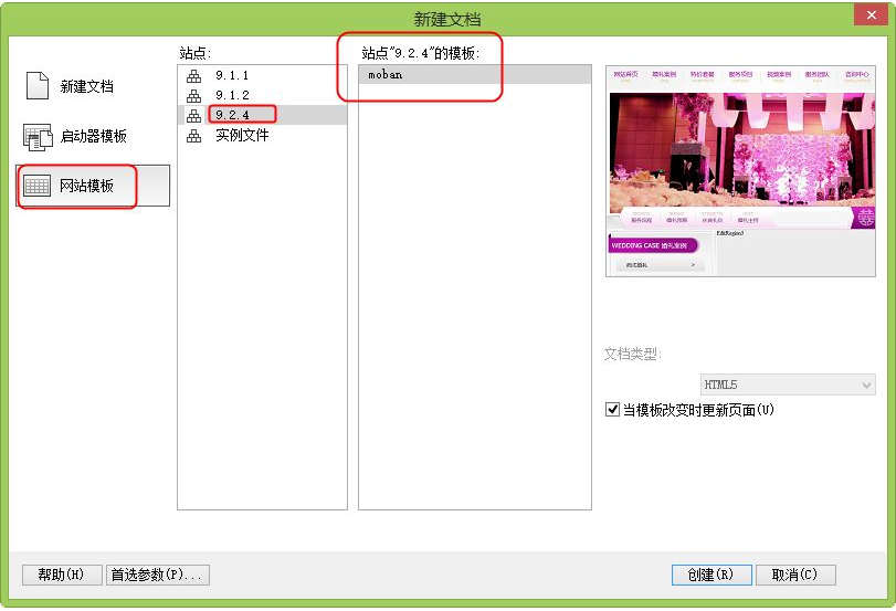 ?選擇菜單中的【文件】|【新建】命令,彈出【新建文檔】對(duì)話框,在對(duì)話框中選擇【網(wǎng)站模板】選項(xiàng)卡中的【站點(diǎn)9.2.4】|【站點(diǎn)"9.2.4":的模板】|【moban】選項(xiàng),如圖