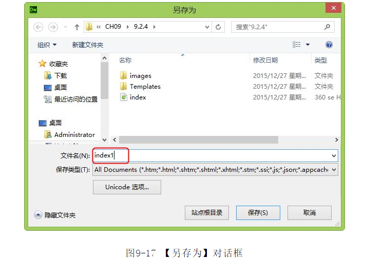 ?選擇菜單中的【文件】|【保存】命令,彈出【另存為】對(duì)話框,在【文件名】文本框中輸入index1.htm,如圖9-17所示。