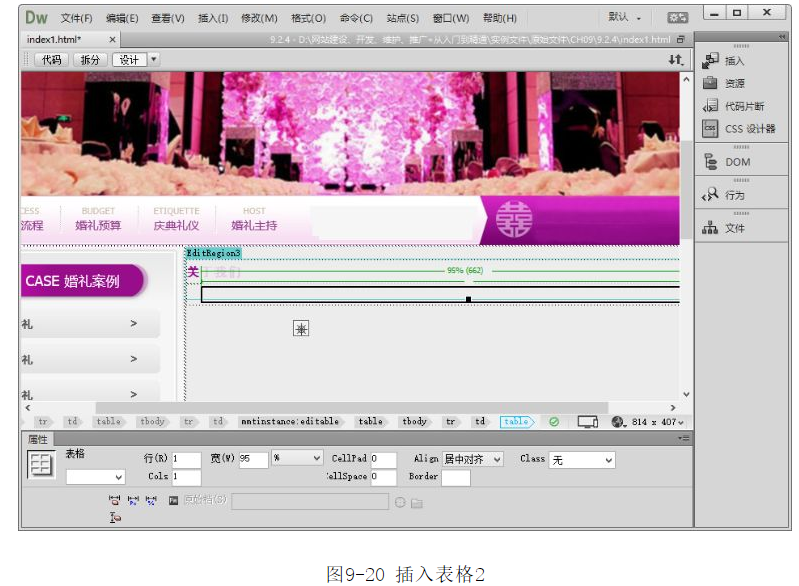 ?將光標(biāo)放置在表格1的第2行單元格中,插入1行1列的表格,將【表格寬度】設(shè)置為95%,此表格記為表格2,如圖9-20所示。