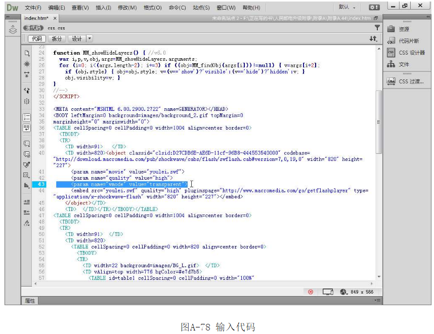 ?在<embed>標記內(nèi)插入wmode=transparent,如圖A-79所示。