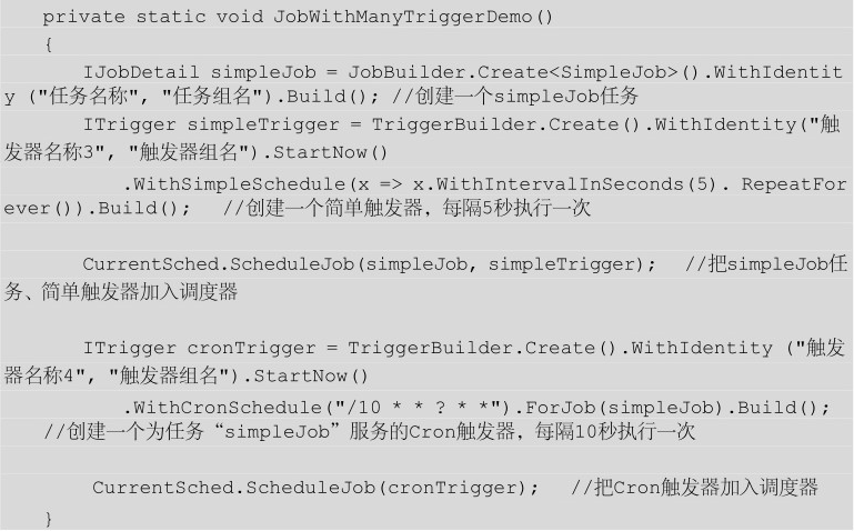創(chuàng)建相應的任務和觸發(fā)器,之后把任務和關聯的觸發(fā)器加入之前聲明的調度器CurrentSched,相應的代碼如下所示。