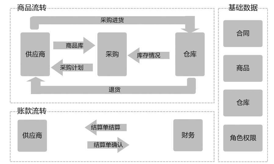 我們可以看到,上述的流轉(zhuǎn)包括商品流轉(zhuǎn)和賬款流轉(zhuǎn)。其中,商品流轉(zhuǎn)是指供應(yīng)商與倉(cāng)庫(kù)屬于供給雙方,采購(gòu)負(fù)責(zé)根據(jù)倉(cāng)庫(kù)和商品需求簽約供應(yīng)商,并根據(jù)倉(cāng)庫(kù)庫(kù)存提交采購(gòu)計(jì)劃。商品計(jì)劃通過(guò)采購(gòu)提交給供應(yīng)商后由供應(yīng)商完成配送,同時(shí)也對(duì)倉(cāng)庫(kù)退貨進(jìn)行管理。在整個(gè)過(guò)程中會(huì)產(chǎn)生采購(gòu)流程和退貨流程,參與的角色包括供應(yīng)商、采購(gòu)和倉(cāng)庫(kù)。賬款流轉(zhuǎn)主要指財(cái)務(wù)根據(jù)賬期對(duì)供應(yīng)商進(jìn)行結(jié)款,結(jié)算主要依存于雙方對(duì)結(jié)算單的確認(rèn)核對(duì),財(cái)務(wù)按照確認(rèn)后的結(jié)算單的賬單金額進(jìn)行支付??偨Y(jié)下來(lái),采購(gòu)的業(yè)務(wù)流程主要有3個(gè):采購(gòu)流程、退貨流程和財(cái)務(wù)結(jié)算。支撐這些流程流轉(zhuǎn)的基礎(chǔ)數(shù)據(jù)是所有單據(jù)的信息來(lái)源,包括合同、商品和倉(cāng)庫(kù)信息等。按照上面講的基礎(chǔ)數(shù)據(jù)、采購(gòu)、退貨和財(cái)務(wù)結(jié)算4個(gè)部分,我們來(lái)看一下每個(gè)部分都有哪些需要注意的內(nèi)容。