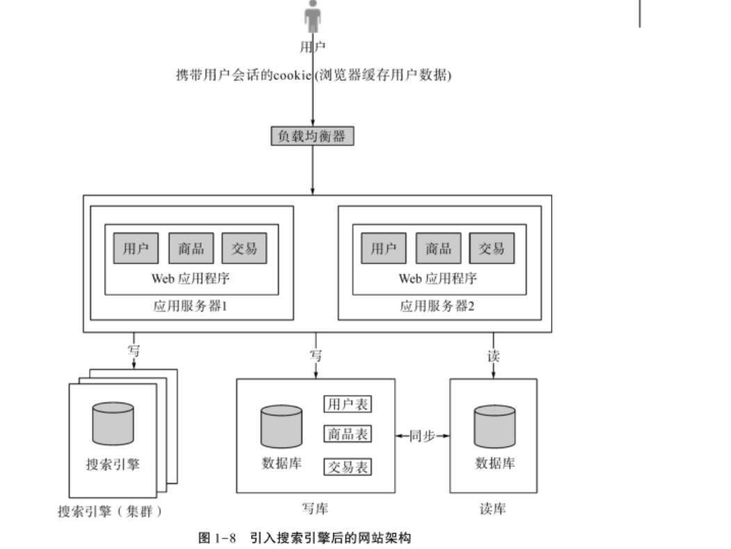 數(shù)據(jù)庫做讀庫的話,常常對模糊查找力不從心,即使做了讀寫分離,這個問題也未能解決。以我們所舉的交易網(wǎng)站為例,發(fā)布的商品存儲在數(shù)據(jù)庫中,用戶最常使用的功能就是查找商品,尤其是根據(jù)商品的標(biāo)題來查找對應(yīng)的商品。對于這種需求,一般我們都是通過SQL的 like功能來實現(xiàn)的,但是這種方式的代價非常大。此時,可以使用搜索引擎的倒排索引來完成,從而大大提高查詢速度。引入搜索引擎后也會帶來一些開銷,比如:需要實現(xiàn)索引的構(gòu)建、維護(hù)搜索引擎集群等。引入搜索引擎后的網(wǎng)站架構(gòu)如圖1-8所示