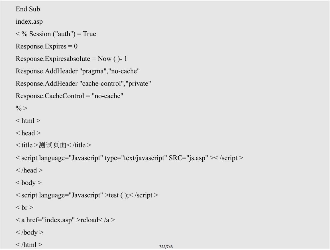 下面來分析index.asp。首先,程序把auth會話變量設(shè)置成了“True”,它表示請求.js文件的頁面應(yīng)該被信任。接下來的幾個Response調(diào)用防止瀏覽器緩存index.asp頁面。