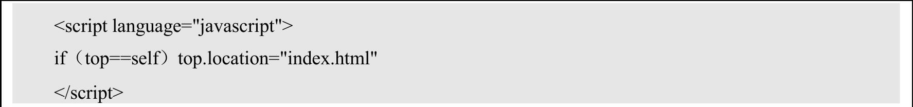 這段代碼將提供跳回功能,當(dāng)瀏覽器試圖單獨讀取該文件時,將自動返回該文件,使瀏覽器循環(huán)讀取該文件,無法看到該頁源文件,但在框架文件中打開時能正常讀取,從而起到保護該頁面的作用。