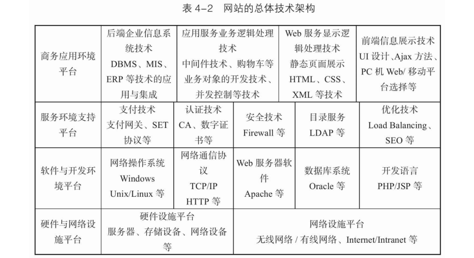 網(wǎng)站建設(shè)公司重點(diǎn)圍繞網(wǎng)站的技術(shù)層面展開描述,以層次化的觀點(diǎn)將網(wǎng)站的技術(shù)架構(gòu)體系層層解析。一個(gè)網(wǎng)站的技術(shù)架構(gòu)體系如表4-2所示。從下到上分別為硬件與網(wǎng)絡(luò)設(shè)施平臺(tái)、軟件與開發(fā)環(huán)境平臺(tái)、服務(wù)環(huán)境支持平臺(tái)、商務(wù)應(yīng)用環(huán)境平臺(tái)四個(gè)層次。