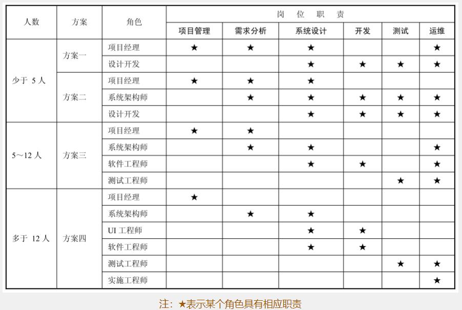 軟件項(xiàng)目團(tuán)隊(duì)的人員規(guī)模一般保持多少比較合適?這個(gè)問(wèn)題沒(méi)有統(tǒng)一的答案。但是,從發(fā)展趨勢(shì)上來(lái)看,軟件項(xiàng)目團(tuán)隊(duì)人員規(guī)模有逐漸小型化的趨勢(shì)。軟件開(kāi)發(fā)的整個(gè)過(guò)程都會(huì)包含需求分析、系統(tǒng)設(shè)計(jì)、代碼實(shí)現(xiàn)、集成測(cè)試、運(yùn)行維護(hù)等活動(dòng)。而這些活動(dòng)會(huì)對(duì)應(yīng)到項(xiàng)目團(tuán)隊(duì)中的不同角色,必須根據(jù)團(tuán)隊(duì)規(guī)模的不同和項(xiàng)目本身的特點(diǎn)對(duì)項(xiàng)目成員的角色和崗位進(jìn)行明確的劃分,這樣團(tuán)隊(duì)中的每個(gè)成員才可能有清晰的責(zé)任和目標(biāo)。項(xiàng)目中進(jìn)行崗位劃分后,每個(gè)崗位成員還可以兼職多個(gè)角色,形成相關(guān)的標(biāo)準(zhǔn)角色崗位職責(zé)矩陣。對(duì)不同規(guī)模的項(xiàng)目,表1-6給出了如何組建團(tuán)隊(duì)的參考方法,對(duì)于表中使用的角色可參考表1-3。