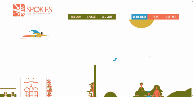 Spokes Eclectic Pedicab Rides是一個提供停車和公共交通的即時解決方案的網(wǎng)站。這個網(wǎng)站號召綠色生活和經(jīng)濟(jì)生活,對以倡導(dǎo)騎車為中心的社區(qū)文化有極大的意義。該網(wǎng)站是漫畫風(fēng)格,滾動頁面時會以不同進(jìn)度載入頁面元素,具有豐富的視差效果。頂部導(dǎo)航欄的設(shè)計也是一個亮點。