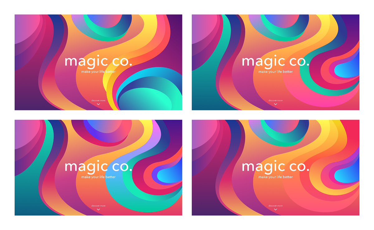 色彩的選取一直都是整個設計中最有趣的部分。由于是要創(chuàng)造出生動而又具有視覺吸引力的設計,設計師開始尋找漸變色的配色方案。想要專門強調特定的色彩并不容易,因為漸變色通常是多種色彩共同構成的,在具體的順序和搭配上有著多種變化,需要持續(xù)地嘗試和探索??傮w上而言,設計師是通過品牌和需求而確定了基礎的四種不同配色方案,再在其中挑選出對比度和協(xié)調度都比較高的組合。最終,她所通過之前的探索,確定使用曲線波紋來構建背景圖形。在這樣的項目當中,通過色彩來主導設計是一件很有趣的事情,同樣也是極具挑戰(zhàn)性的任務。至于這個流程,按照 Ludmila 的說法,她是在單獨的頁面上進行漸變色彩的組合,仔細調整漸變色的過渡。她將注意力集中在色彩本身的選取上,確保整體的配色是干凈且富有活力的。