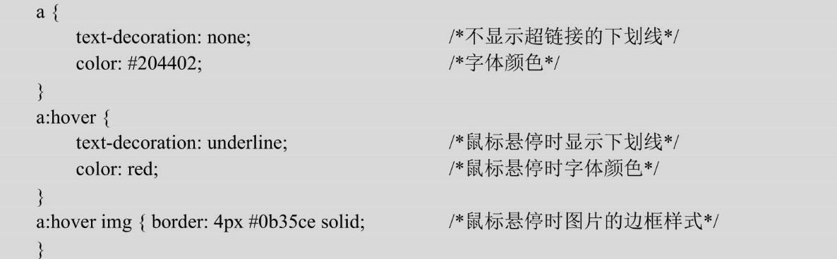 <a>標(biāo)簽的樣式設(shè)置了下劃線, a:hover定義了當(dāng)鼠標(biāo)懸停時(shí)鏈接的樣式。a:hover img定義了圖片在鼠標(biāo)懸停時(shí)的樣式。關(guān)于<a>標(biāo)簽的