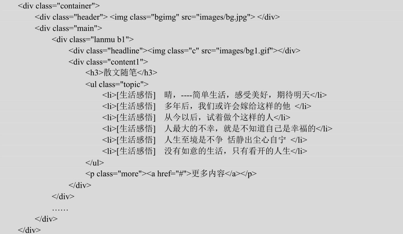第2步,構(gòu)建網(wǎng)頁結(jié)構(gòu)。本例首先用<div>標(biāo)簽設(shè)置contaiuer容器,然后分別用<div>標(biāo)簽將頁面分為header和main兩部分。以下為部分代碼,完整代碼請參考本節(jié)示例源代碼。