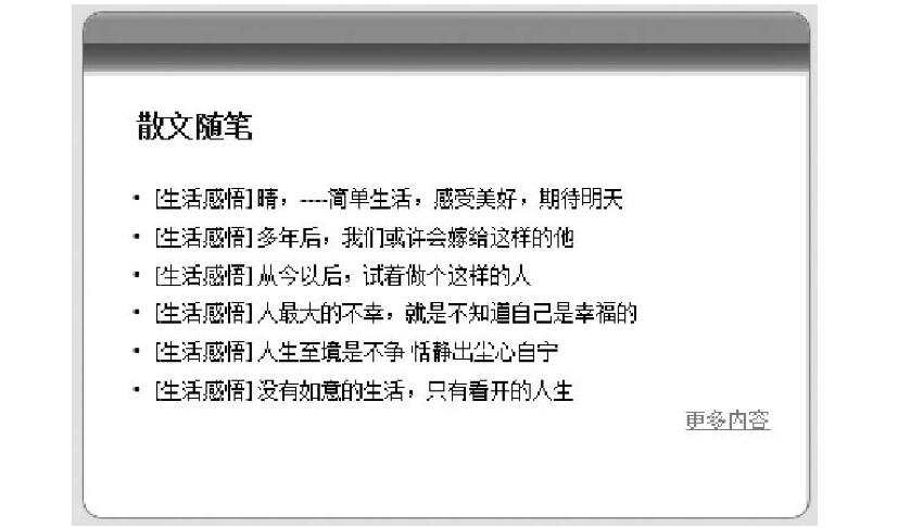 欄目圓角化是網(wǎng)上常見的以種美化網(wǎng)頁的方法,本例運(yùn)用上面介紹的圖片圓角化方法,通過設(shè)置個(gè)名為《X品文摘》的網(wǎng)頁,從而進(jìn)步講述css設(shè)置圖片的方法。本例的演示效果如圖5.55所示。