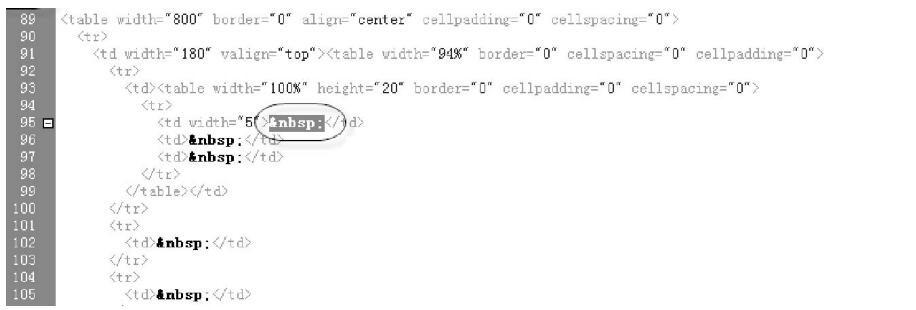 網(wǎng)站設(shè)計(jì)豎線處理第3步,當(dāng)要設(shè)置單元格高或?qū)挒樽钚≈禃r(shí),就應(yīng)該把這些空格符號(hào) .清除掉,方法是把光標(biāo)置于該單元格內(nèi)或選中該單元格,再切換到【代碼】視圖,把<tdwidth:”5”> ,</td>代碼中的 ,刪除即可,如圖6-35所示。