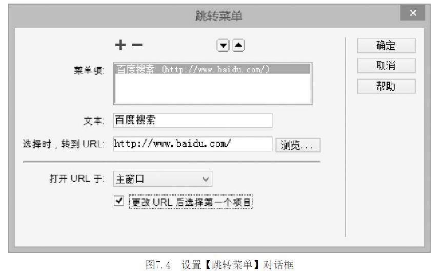 第5步,在【打開URL于】下拉列表框中設置打開鏈接的窗口。如果選中【更改URL后選擇第個項目】復選框,可以設置在跳轉菜單鏈接文件的地址發(fā)生錯誤時,自動轉到菜單中第個項目的網(wǎng)址,如圖7.4所示。