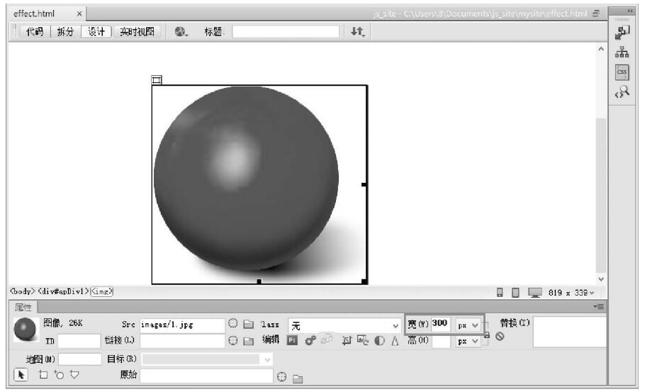 第2步,把光標(biāo)置于頁(yè)面中,選擇【插入】【圖像】【圖像】命令,在頁(yè)面中插入個(gè)小球,在【屬性】面板中設(shè)置小球?qū)挾?為300像素,如圖7-52所示。