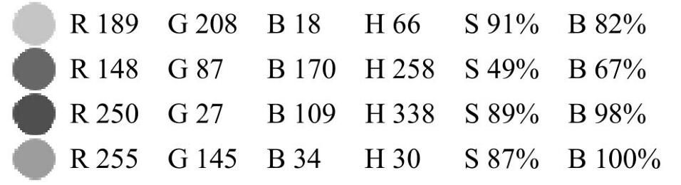 從RGB數(shù)值顯示上看,綠色含量較高達(dá)到208.混合了R189的黃色光.因此顏色偏黃綠色,由于添加了B18.飽和度相對降低。玫瑰色中R的含量最高.與B109混合為主要組成色,添加了少量的G27黃,純度偏高。橙色中R的含量很高為2ss.混合了G145黃為主要組成色.添加了第三色B34,飽和度稍降低。紫色是由藍(lán)色和紅色調(diào)配而成,B為170,R為148,混色分量相當(dāng)也就成為了組合紫色這間色的主要成分,但是由于添加了G87,也是4組顏色中的間色混合第三色數(shù)值最高的,HSB中S數(shù)值相對其他三色,降低很多,因此顏色相對于其他3種較沉穩(wěn)、