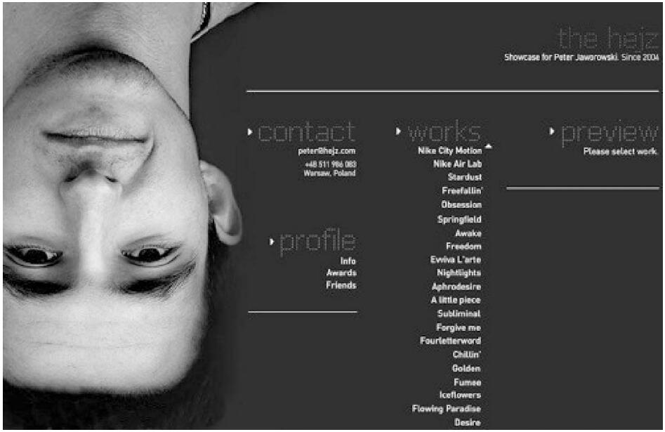 整個頁面效果如同古老的黑白照。初看該頁面容易把背景的源灰色誤認為是黑色,再仔細觀看就感覺到了此種深灰色不凡的作用,假如背景色使用了黑色,頁面的主體人物和空間感的相互作用就變得僵硬且呆板。