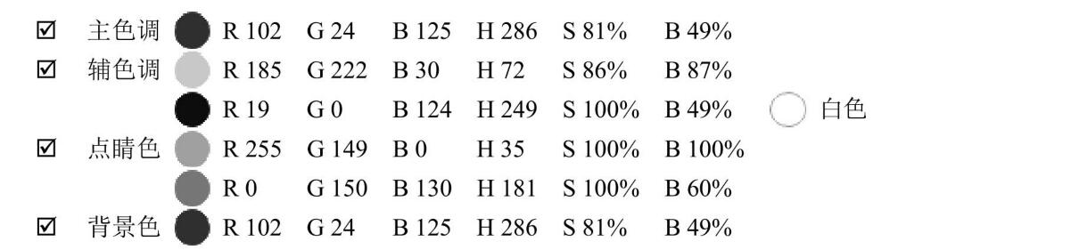 輔色調(diào)HSB的H色相數(shù)值為270,已經(jīng)稍往紫色偏移,紫色特征較明顯,明度較而且較明快的感覺(jué)。另輔助色粉紅色H色相數(shù)值為331稍往紅色系偏移,明度極高為100%,更增添了明快的氣息。