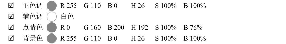 HSB數(shù)值中的H色相顯示主色調橙紅色為26,因為正紅色的H為。,正橙H為30,主色調橙紅色是往。偏移而得。正藍色是240.而該點睛色藍色為192.往綠度偏移,在RGB中的數(shù)值G160也能看出來,因此藍色的特性不是很強。但由于橙紅色的明度和飽和度達到最高值,因此盡管藍色不是正藍,但它的特性得到了很大程度的發(fā)揮。