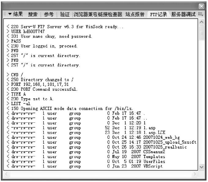 第9步,當遠程服務器為FTP服務器時,用戶可以開啟【FTP記錄】面板,實時跟蹤信息的傳輸情況。方法是在【結果】面板組中選擇【FTP記錄】面板,當連接到FTP服務器之后,該面板會不斷滾動顯示實時傳輸信息,如圖13-20所示,