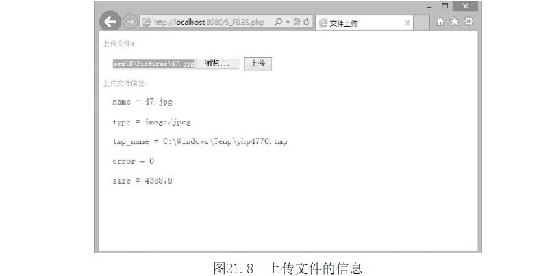 【示例】如何獲取上傳文件的相關(guān)信息,頁面代碼如下($_FILES.php),演示效果如圖21.8所示。