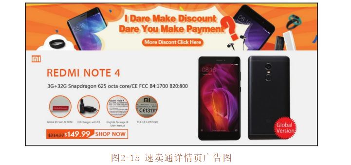 (1)廣告圖。從2015年7月開(kāi)始,速賣(mài)通平臺(tái)為了讓賣(mài)家的優(yōu)質(zhì)產(chǎn)品信息擁有更多維度的展示形式,配合賣(mài)家產(chǎn)品優(yōu)化,上線了產(chǎn)品視頻,允許在詳情頁(yè)中上傳視頻,用以進(jìn)行產(chǎn)品宣傳。視頻可以從多個(gè)緯度向買(mǎi)家展示產(chǎn)品的特性。速賣(mài)通詳情頁(yè)廣告圖如圖2-15所示。