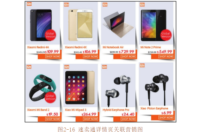 (2)關(guān)聯(lián)營(yíng)銷(xiāo)圖。關(guān)聯(lián)營(yíng)銷(xiāo)產(chǎn)品信息的“模塊”一般放在詳情頁(yè)的最上面,也就是說(shuō),當(dāng)買(mǎi)家進(jìn)入詳情頁(yè)后,在瀏覽產(chǎn)品前,先向買(mǎi)家推薦本店其他產(chǎn)品,增加買(mǎi)家進(jìn)入其他頁(yè)面的可能性,從而引導(dǎo)流量。防止買(mǎi)家因?yàn)榭催^(guò)產(chǎn)品后沒(méi)有興趣,而直接關(guān)閉頁(yè)面離開(kāi)店鋪。在這個(gè)區(qū)域,一般會(huì)放置一些美觀的廣告圖、海報(bào)圖或者放置一些重要的想告訴買(mǎi)家的信息,同時(shí)還可以放置一些關(guān)聯(lián)營(yíng)銷(xiāo)圖,如圖2-16所示。